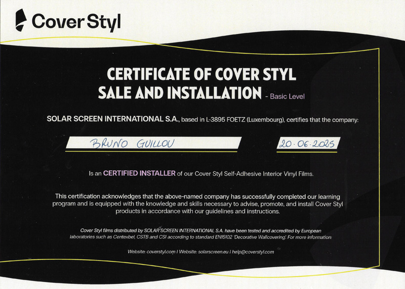 Le Covering Architectural n’est pas inné et implique une mise en œuvre spécifique avec des produits particuliers et sur des surfaces adaptées. En suivant la formation en présentiel au Luxembourg dans les locaux de l’entreprise Cover Styl, j’ai pu décroché mon diplôme de poseur certifié par l’entreprise.